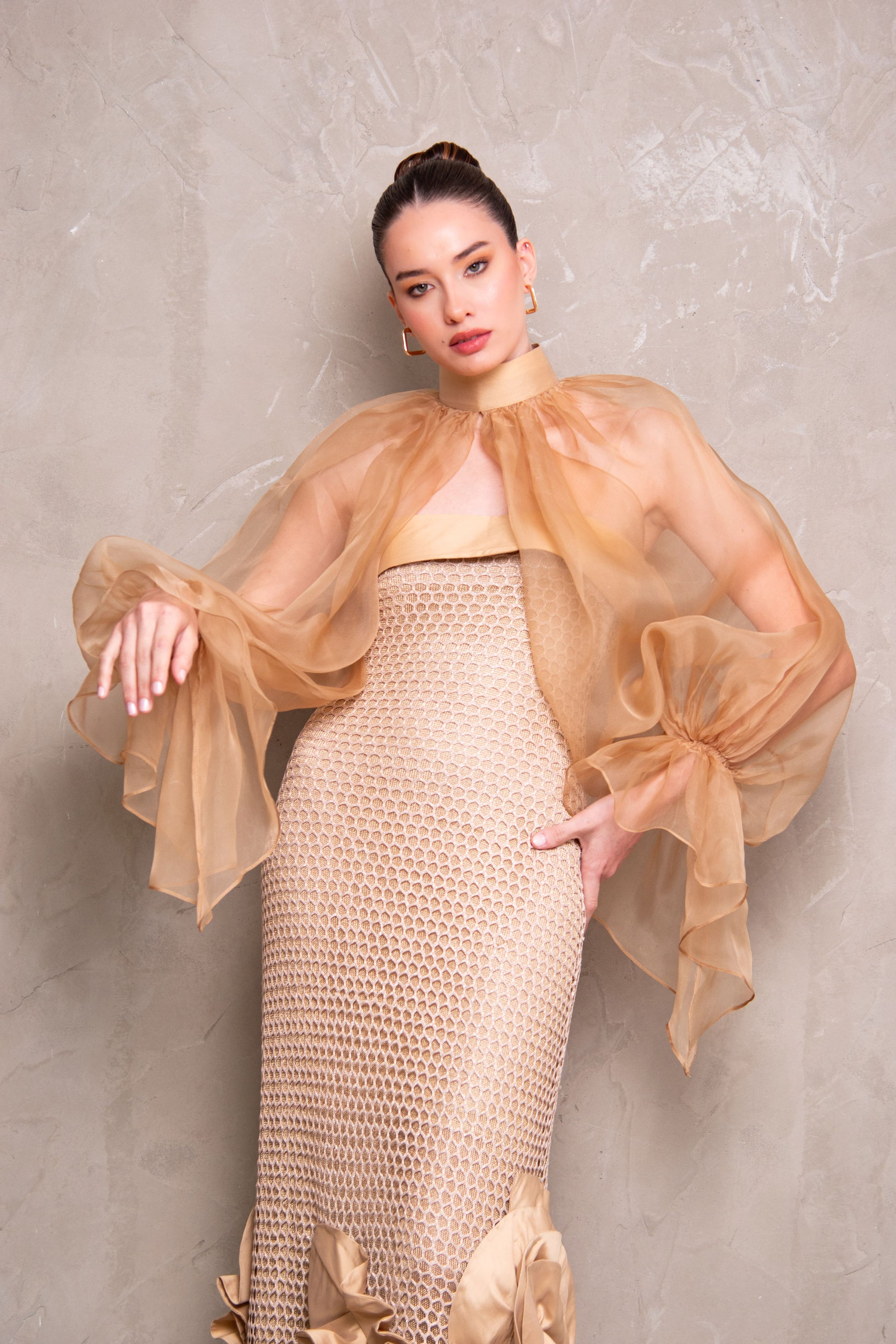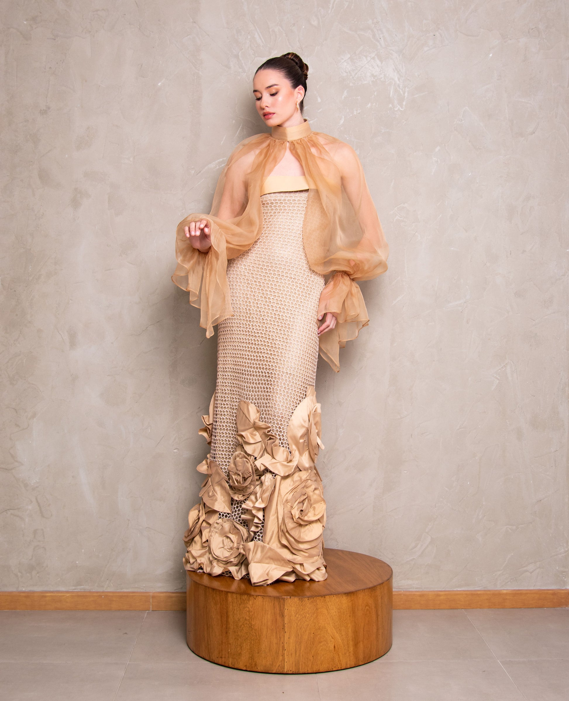 Maxi dress de red con aplicaciones de flores + Mangas de organza