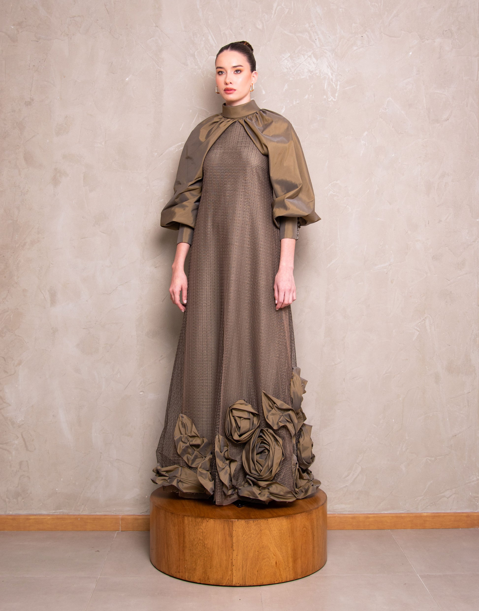 Vestido largo de red con aplicaciones de flores + Mangas abullonadas